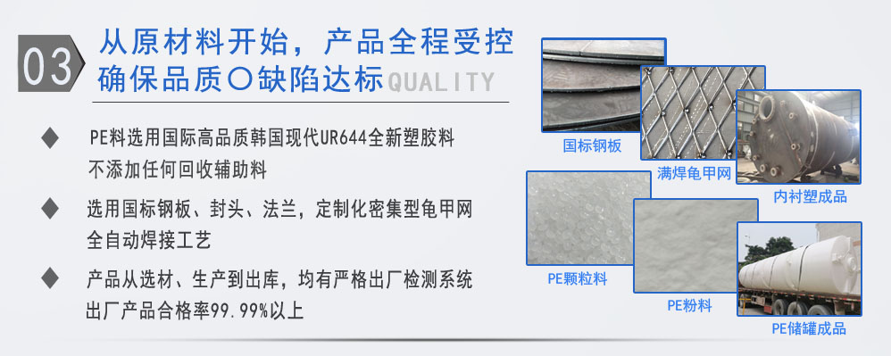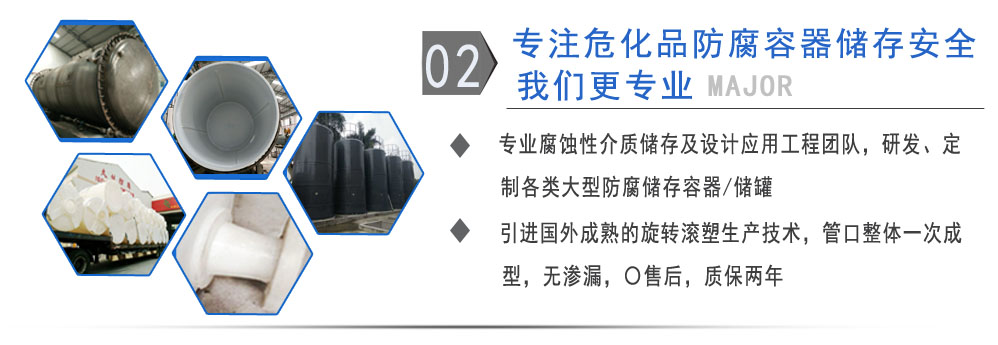 公司有鋼襯塑PE/PO、PE全塑、碳鋼、不銹鋼四大系列100多個品種,專注于常壓儲存容器生產,其產品包括鋼襯塑儲罐、管口一體成型PE儲罐、碳鋼儲罐不銹鋼儲罐、反應釜、攪拌罐、離子交換柱、鋼襯PE/PO儲罐、塑料儲罐鹽酸儲罐硫酸儲罐等等。更大限度滿足廣大客戶的各種需求,同時可以根據客戶的需要加工定制各種防腐設備。